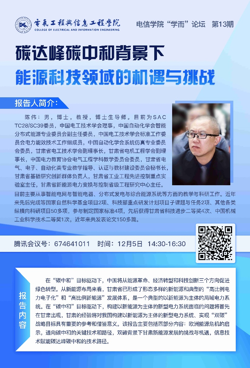 能源电力行业作为实现“双碳”目标的重要领域,其低碳/零碳发展对我国实现“双碳”目标起着至关重要的作用。陈伟教授分享了自己对“双碳背景下能源科技领域的机遇与挑战”的见解,从欧洲能源危机的启示、通向碳中和的关键技术和路径、双碳背景下甘肃新能源发展的挑战与机遇和信息技术赋能碳达峰碳中和的技术路径四个方面作了详细论述。报告指出甘肃省已经形成了形态多样的新能源和典型的“高比例电力电子化”和“高比例新能源”发展体系,是一个典型的以新能源为主题的局域电力系统。在“碳中和”目标驱动下,构建以新能源为主题的新型电力系统面临的问题将首先在甘肃出现,甘肃经验将对我国构建以新能源为主体的新型电力系统、实现“双碳”战略目标具有重要的参考和借鉴意义。