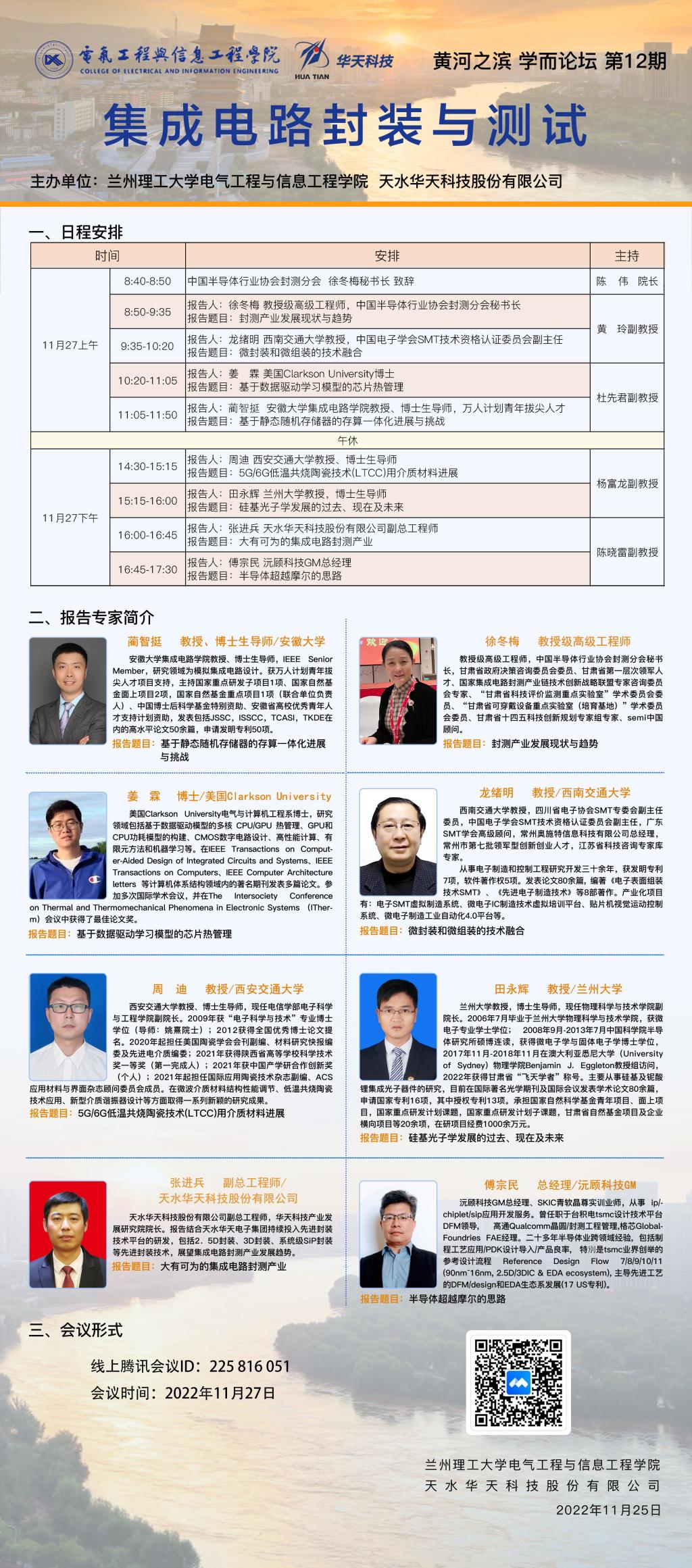 于线上成功召开。会议邀请了中国半导体行业协会封测分会徐冬梅秘书长、西安交通大学周迪教授、兰州大学田永辉教授、安徽大学蔺智挺教授、西南交通大学龙绪明教授、Clarkson大学姜霖博士、天水华天科技股份有限公司张进兵副总工程师和沅顾科技GM傅宗民总经理等专家学者,共同探讨我国和我省半导体封装与测试的发展新动态、新趋势与创新技术,为集成电路未来技术巨乳做爱