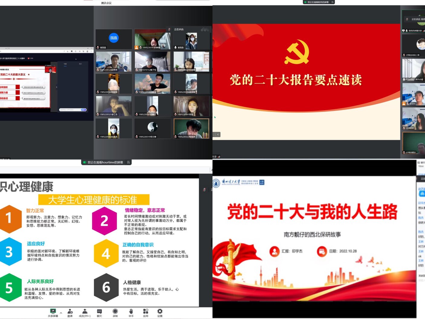 青年博士学术讲座暨2021级巨乳做爱入学教育系列活动-‘研途’生活分享”活动,确保“听课不停学”“停课不停教”;邀请校团委老师开展“快乐成长,健康生活”——2022级新生心理健康讲座,安抚因突如其来的疫情可能引起学生们的紧张、不安等情绪;开展学习“二十大精神”主题党团日活动、“党的二十大与我的人生路”研学专题活动、“同心抗疫 共克时艰”主题班会、“你好,电信”爱校主题教育等活动,变“面对面”为“键对键”,激励广大学子攻坚克难、开拓创新,引领学生坚定抗疫必胜信念。运筹帷幄,决胜千里,他们始终坚定必胜信念,云端守望,不遗余力为学校教书育人保驾护航。