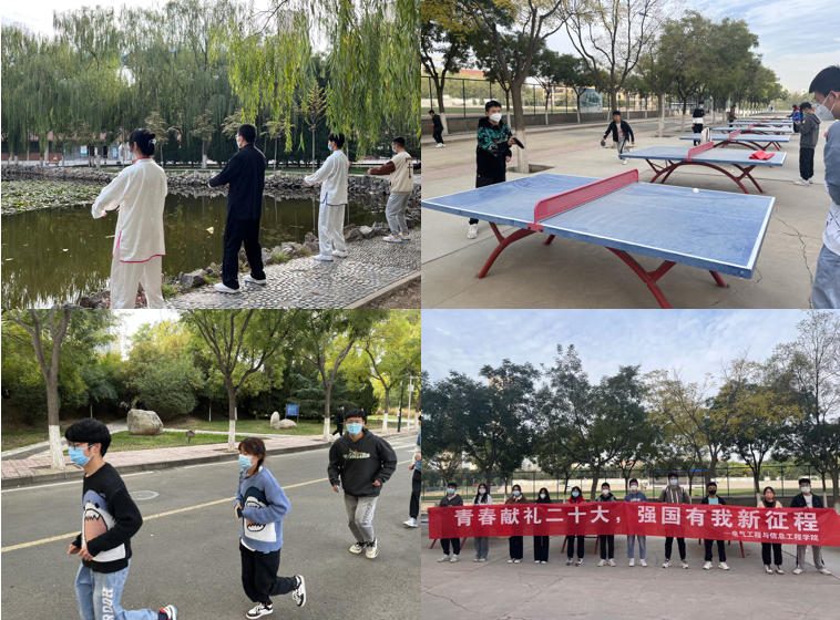 团委、学生会组织,以团支部或宿舍为单位,举办跳绳达人赛、毽球比赛、乒乓球赛等微型阳光体育系列活动。定向越野协会、国球交友协会、太极养生协会,同时开展运动健身活动,引导广大同学文化学习和体育锻炼协调发展。同学们纷纷表示要响应号召“走出宿舍、走下网络、走向操场”,养成健康文明的生活方式,用实际行动迎接党的二十大。