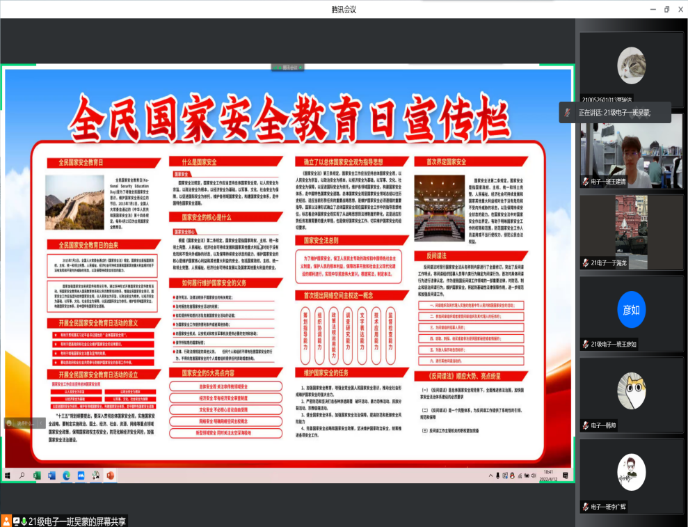 各年级团支部以“学习+分析+感悟”的方式开展,首先是为同学们普及国家安全知识,包括《国家安全法》、《反间谍法》等法律法规,让同学们全面了解国家安全的基本常识。随后,各团支书组织同学们观看了国家安全相关视频,并结合一些教育案例为大家进行了剖析,通过对经典案例的分析,让同学们了解侵犯国土安全的基本方式以及侵犯国土安全的基本人群,让大家明白了侵犯国家安全的危害巨大,影响恶劣。在学习感悟分享环节中2020级电子1班张敏娟同学说“国家安全是国家的根本所在,国家安全是头等大事,是国家生存发展的前提,人民幸福安康的基础,同时作为当代大学生我们要紧跟总体国家安全观,从自身做起保护国家安全。”