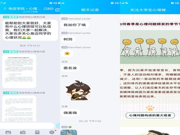 心理健康辅导站组织了“心理树洞”活动,让同学们可以在心理树洞中尽情倾诉自己的烦恼,让心理树洞来解决问题。在心理树洞中,匿名性可以让你尽情倾诉你心中的压抑,在保护隐私的前提下,倾听你的声音,为你解答疑惑。同时,心理委员会定期宣传一些心理健康短文,让大家了解到心理小知识,一起维护同学们的身心健康。(撰稿:逯滢;终审:王玲)