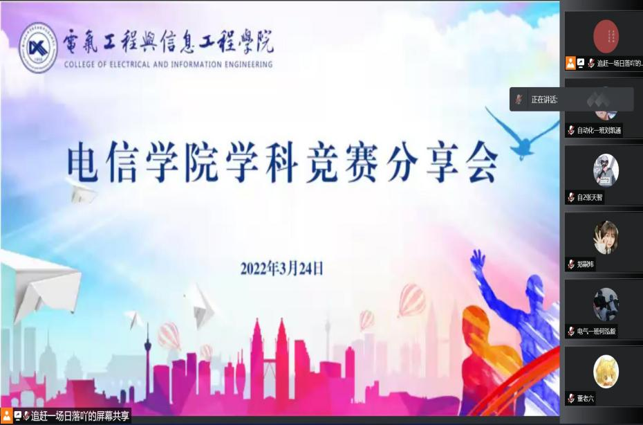 19级、20级励志奖学金、国家奖学金获得者,学科竞赛先进学生等优秀学生代表为20级、21级的同学们就学科竞赛内容、参赛方法、参赛资料等进行了线上分享。在分享会上,各位优秀、先进学生结合自己的实际经历,就教育部学科竞赛排行榜内相关比赛的报名方式、比赛内容、实践操作等方面一一为同学们进行了详细的介绍,其中19级电气基地班印宇杰同学从比赛心态、参赛计划、赛后总结三个方面为大家进行分享,“首先,我要说的是“心态”,可以说好的心态是在比赛时取得优异成绩必不可少的要素,没有好的心态就难以在比赛时发挥出真实的水平。其次是赛后总结,在参加比赛时,大家应该进行思考,要找到比赛之间的相似性、相关性,对比找到不同性,这样才能提高效率。”20级自动化3班杨泷瑞同学分享了自己参加互联网+、挑战杯、智能车比赛的经历“在参加比赛之前,大家要制定自己的目标,有目标就有动力,不要畏惧。我认为不错的参加比赛的方法是赛前最好做好准备,如果实在是没有相关参赛经历就应该多学多看多问,跟着老师的思路走,多向高年级的学长们请教一下,这样你会节省很多的时间,不然你可能得花成倍的时间去弄懂比赛内容及要求。”