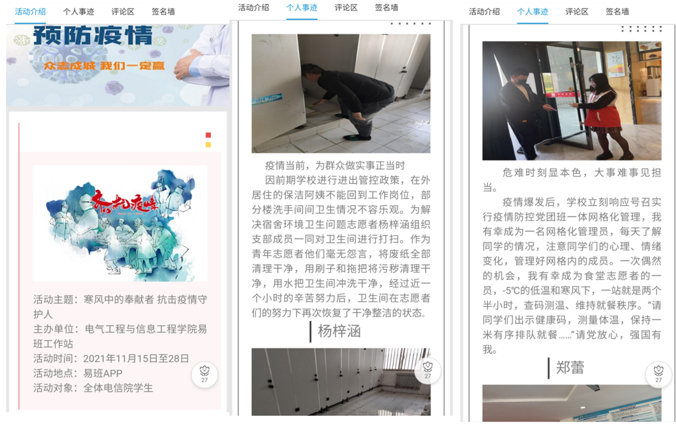 依托易班平台开展“寒风中的奉献者 抗击疫情守护人”主题志愿者事迹征集活动。全院学生踊跃参与,主题宣传效果显著。