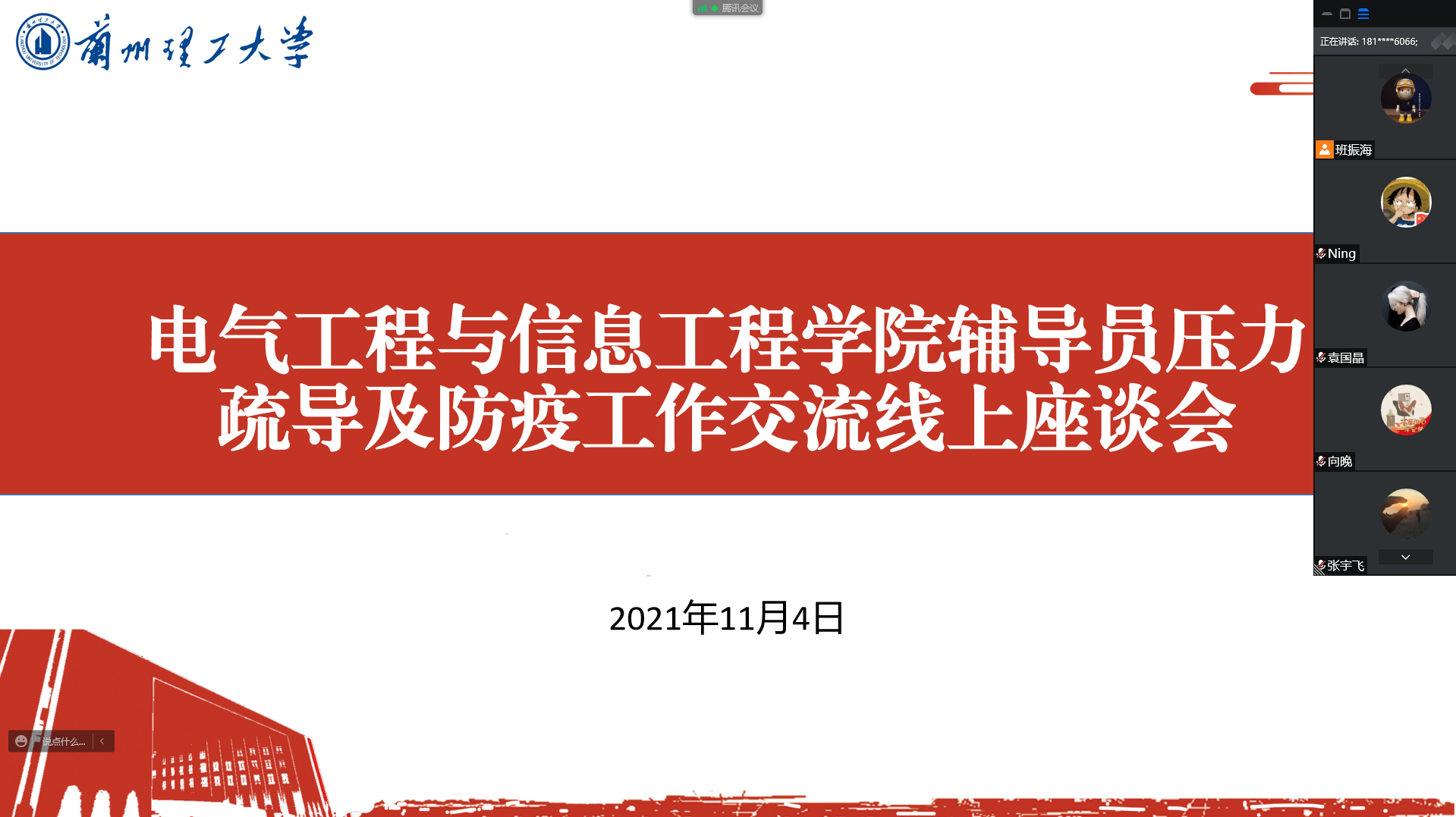 此次辅导员压力疏导及防疫工作交流线上座谈会,进一步了解了处在学校“防控一线”的辅导员的工作状态,有利于学生工作部后期更好地开展相应的工作。他强调,希望辅导员们在开展疫情防控工作时,进一步提高政治站位,把工作抓在手上,责任扛在肩上,将学校各项工作落实到位,要加强对重点学生的关注,认真落实“一对一”帮扶等工作;同时辅导员在工作中要学会自我疏导,做好个人防护,继续以讲政治的态度,讲担当的精神,讲实效的作风,确保打赢疫情防控阻击战。(撰稿:王洁;终审:王玲)