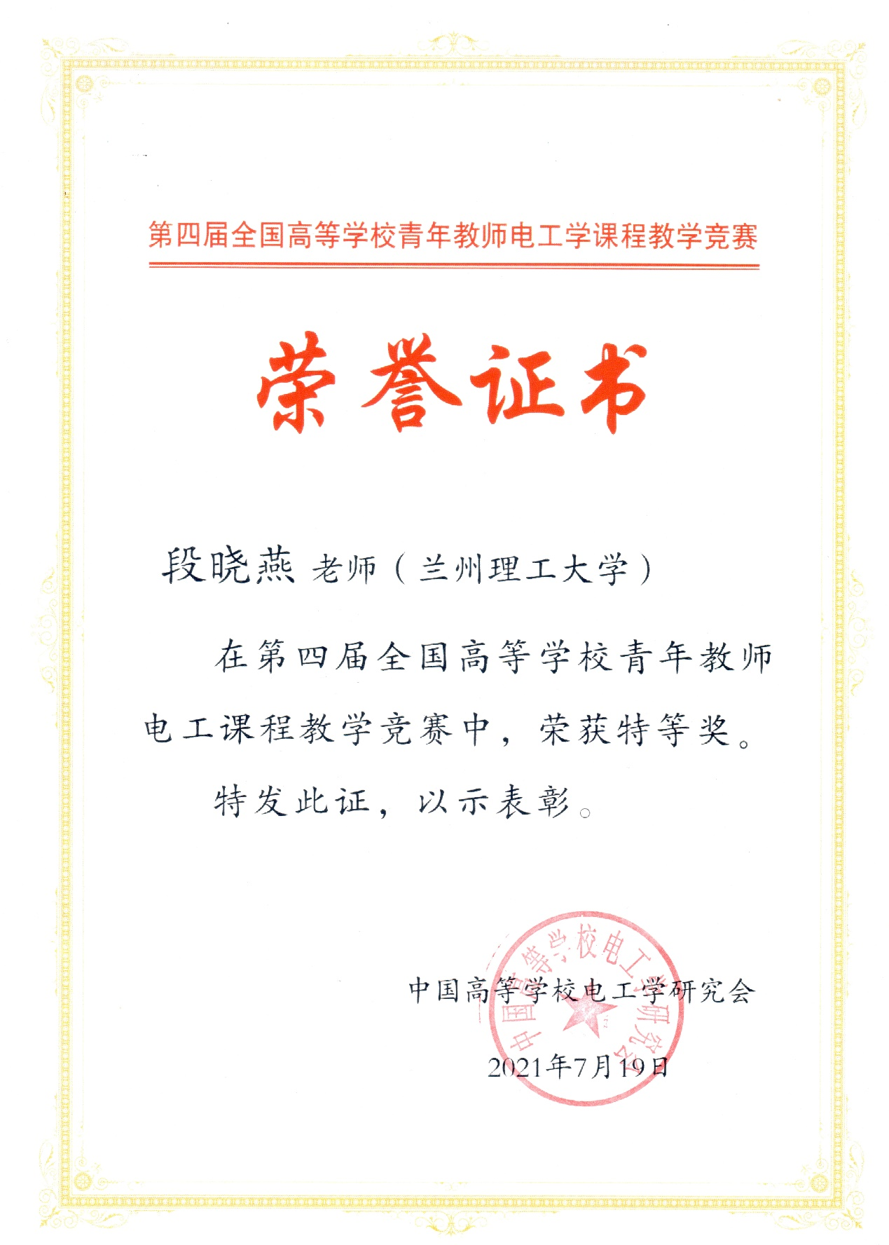 段晓燕老师作为甘肃省青年教师电工学课程教学竞赛特等奖获得者,代表甘肃省参加了第四届全国高等学校青年教师电工学课程教学竞赛决赛。决赛在中国矿业大学举行,来自全国29个省市的58名教师参加了此次大赛。经过三天的激烈角逐,段晓燕老师摘得桂冠,荣获全国高等学校青年教师电工学课程教学竞赛特等奖,实现了我省特等奖零的突破。