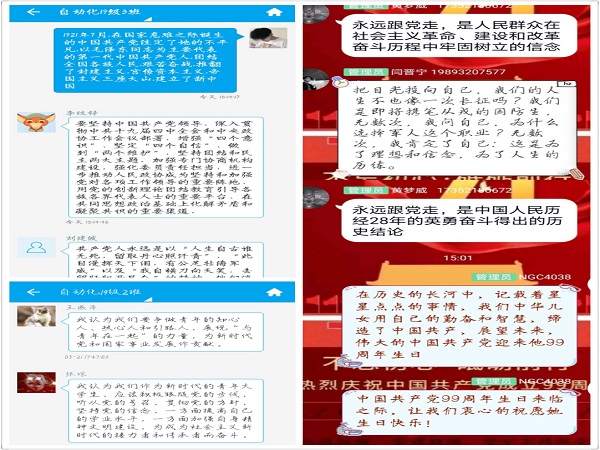 2019级各班围绕党的光辉历程、丰功伟绩和党章党规、习近平总书记系列重要讲话精神等内容,以线上线下相结合的形式分别开展了特色主题班团日活动。电气基地班依托腾讯会议在线召开了主题班会,会议在庄严的国歌声中开始,通过集体观看党史微视频,同学们一起重温了红船精神,坚定了共产主义信仰信念。自动化3班在蔚云楼206教室召开了主题团日活动,团支书首先结合党史简要介绍了建党节的由来,接着同学们分享了革命烈士的英雄事迹,深刻感悟了共产党人大无畏的革命精神。