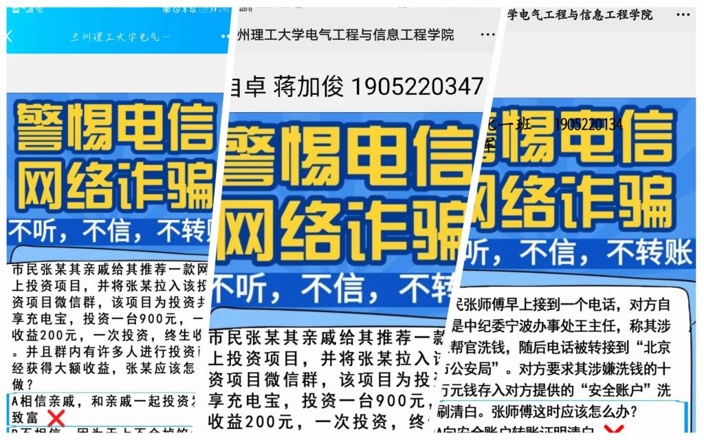 通过制作发布“诈骗情景”模拟闯关挑战,全院学生积极参与,切身感受及体验电信诈骗的相关环节及内容,参与率高达90%。情景模拟闯关通过视频与问题回答相结合的方式,更加直观地为同学们展示了电信诈骗的四种不同手段,看与做相结合的方式使同学们在现实中遭遇相同情况时也可以做出正确的选择。