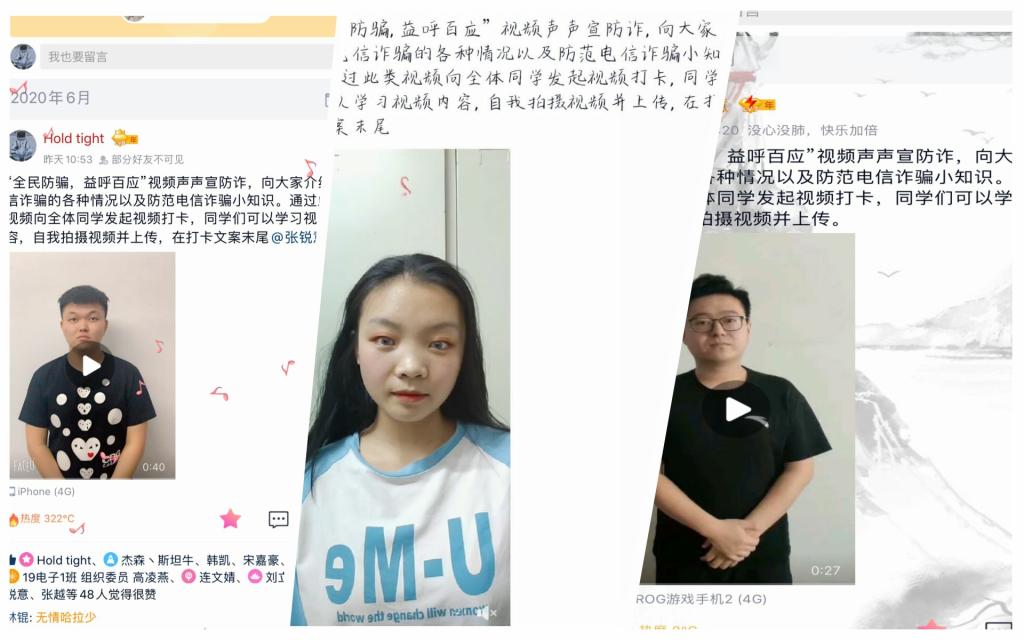 通过QQ平台等新媒体渠道制作发布“防诈抵贷”宣传视频,以通俗易懂的防诈抵贷顺口溜为大家介绍电信诈骗的各种情况以及防范电信诈骗小知识,并发起视频打卡活动,同学们在学习视频内容后,自己可以拍摄视频上传到平台,在打卡文案末尾@出下一位同学做为挑战者,全院同学积极参与,积极营造“全民防骗,益呼百应”的氛围。