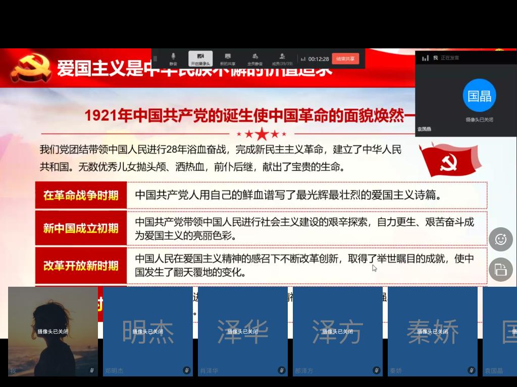 最后,刘洪国从历史与现实两个维度,论证了中国共产党是人民的选择,是历史的选择。他指出,爱国主义是中华民族精神的核心,中国特色社会主义进入新时代,必须大力弘扬爱国主义精神。青年大学生是国家未来发展的中流砥柱,必须坚持道路自信、理论自信、制度自信和文化自信。同时,他对支部提出了三点希望:一是不断加强政治理论学习,深入贯彻习近平新时代中国特色社会主义思想;二是坚持理论与实践相结合,有机会多去博物馆、纪念馆和红色遗址等爱国主义教育基地参观学习;三是要笃定实干,在学习和生活中不断发挥党员的先锋作用。