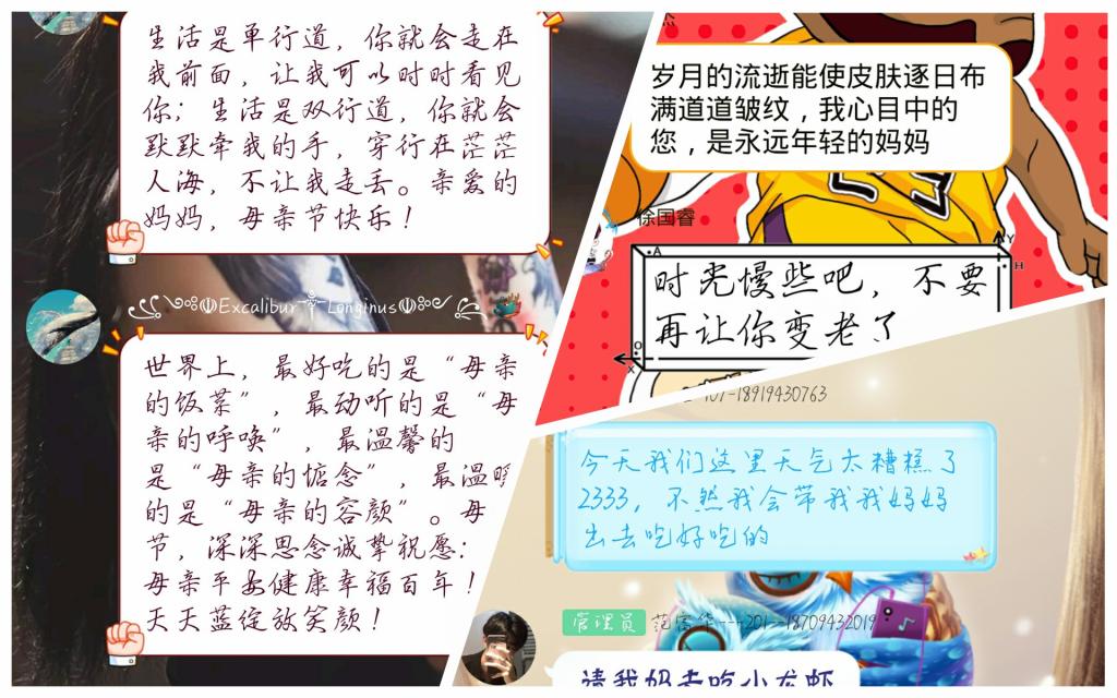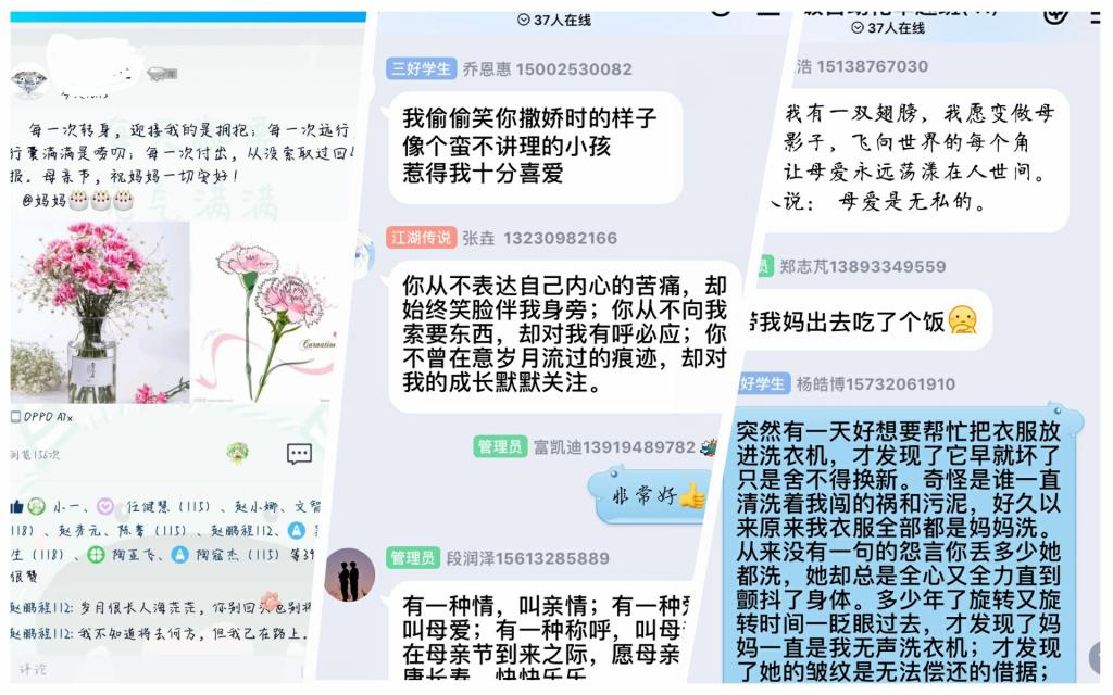 主题班会上大家分享了自己所知道的关于母爱的故事。19级机器人工程一般俞少卿同学在留言中说到:“总感觉自己还是个孩子,可是您却已经慢慢变老,从小到大,记得你最常说的一句话是,我不爱吃,你吃吧。直到长大,才明白背后的意义。”有的班级策划开展了“云”展览,在母亲节这天展出自己“与母亲有爱瞬间”的照片、母亲的厨艺等等。
