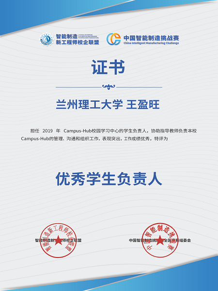 Campus-Hub校园学习中心(以下简称学习中心)获得智能制造新工程师校企联盟和中国智能制造挑战赛组委会(以下简称组委会)联合颁发的2019年优秀工作单位称号,学习中心负责人王盈旺同学获优秀学生负责人称号,以奖励学习中心在过去一年建设过程中的优异表现。