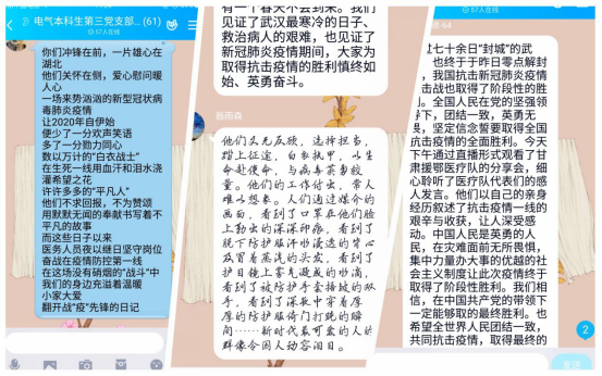党委牵头组织各党支部结合实际,积极开展主题党日活动,创新“三会一课”载体,履行“三会一课”制度,确保制度落实不放松、思想学习不掉线、抗“疫”行动不放假,充分发挥党支部战斗堡垒作用。各党支部广泛开展“阻击疫情,党员先行”系列党日活动,引导学生党员、党员发展对象、入党积极分子主动亮明身份,深刻认识做好疫情防控工作的重要性和紧迫性,按照坚定信心、同舟共济、科学防治、精准施策的要求,在坚决打赢疫情防控战中践行初心使命,体现责任担当。