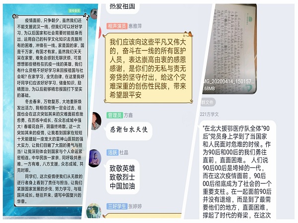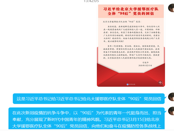 在此次学习《回信》过程中,大家学精神、谈感想、抒体会,充满了对中国特色社会主义制度的自信与自豪。各支部围绕习近平总书记“广大青年用行动证明,新时代的中国青年是好样的,是堪当大任的!”等重要内容,谈自己在习近平总书记回信中所领会到的精神,谈本次疫情中当代青年的作用,并纷纷表示要牢记总书记嘱托,以抗击疫情的白衣天使为榜样,发挥团员的先锋模范带头作用,以北京大学援鄂医疗队全体90后党员为榜样,激励有理想、有本领、有担当的电信学子在今后不忘初心,奋发有为,努力为祖国发展、民族复兴贡献自己的力量。