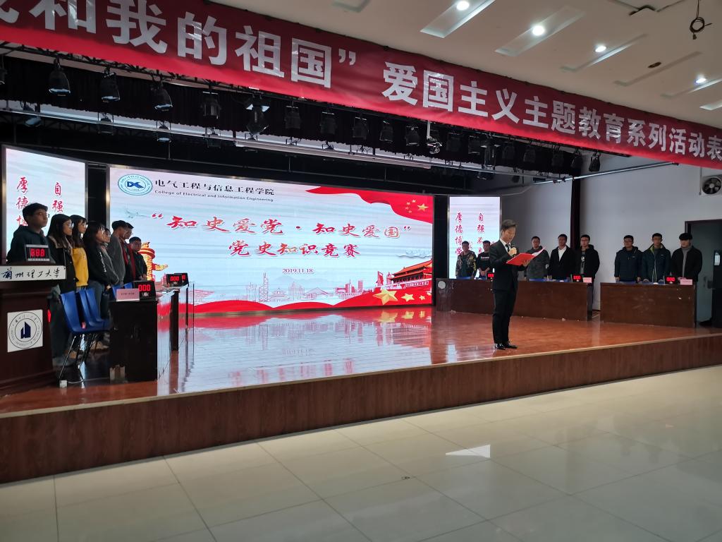 “知史爱党·知史爱国”党史知识竞赛在雄壮的国歌声中拉开帷幕,本次决赛围绕“党的历史”“十九大精神”“习近平新时代中国特色社会主义思想”“十九届四中全会精神”等重要内容,共设置“必答题”“抢答题”和“博弈题”三个环节,进入决赛的六支学生党支部代表经过激烈的角逐,最终电气本科生第三党支部摘得桂冠。