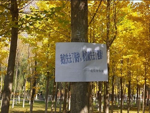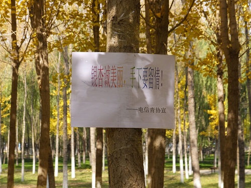 青年志愿者协会,穿着天蓝色的服装,在西校区银杏林开展“保护银杏林,我们在行动”志愿服务活动。 金城十月,工大银杏林焕发了迷人的色彩,同学们在欣赏美景的同时也带来了许多不文明现象。志愿者们拣除银杏林内各类垃圾,引导同学们文明观赏,经过努力,美丽的黄金走廊再次呈现在人们眼前。志愿者们还制作了许多温馨提示卡,呼吁大家建设“美丽工大”,希望在全校师生的共同努力下,银杏林成为工大校园“最美丽的一道风景”。 |