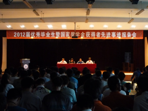 在大学生活动中心隆重举办了2012届优秀毕业生暨国家奖学金获得者先进事迹报告会。大会由11级辅导员李正安老师主持,三名2012届优秀毕业生代表以生动鲜活的语言,与五百多名同学共同分享了他们的成长经历。