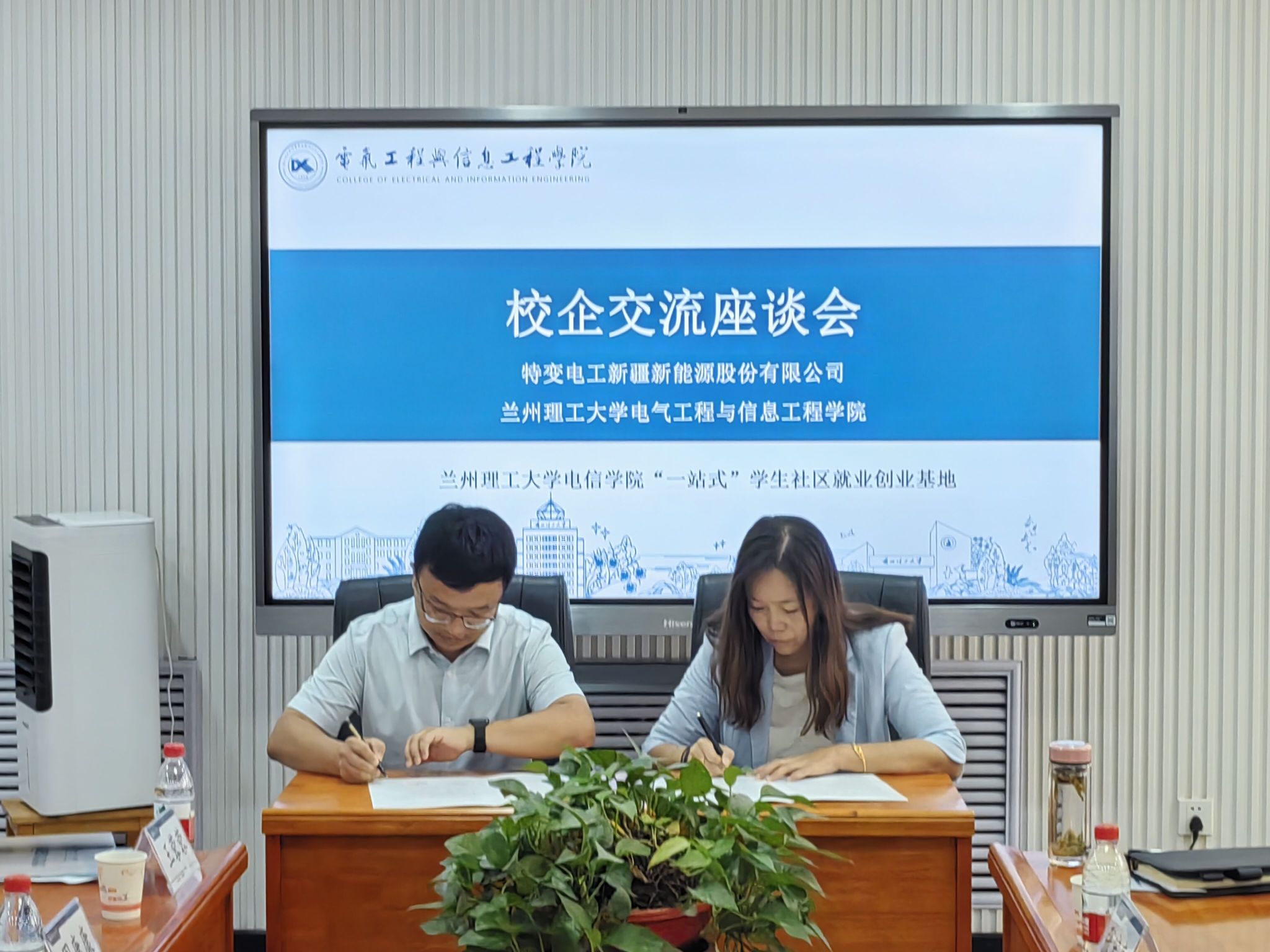 师资队伍、学科方向、科研特色、实验室建设等进行了介绍;刘炜结合目前毕业生的就业去向、学生就业实践基地建设等相关事宜做了详细的解释,并谈到,特变电工历来都是我院毕业生就业的热门企业,希望今后双方能够加强合作,继续扩大合作成果。特变电工新疆新能源股份有限公司李虎汇报了企业目前的发展现状、科研业务合作等工作。与会双方现场签订毕业生就业基地建设合作协议书。