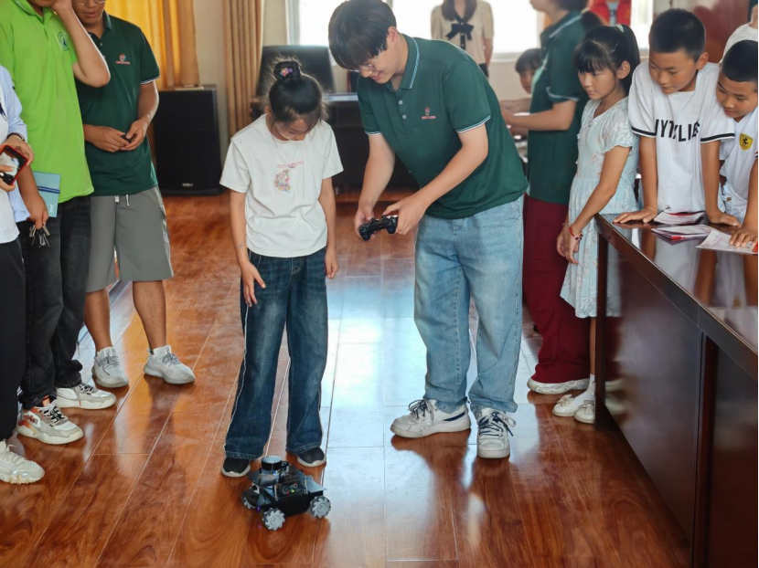 在东铺社区“爱心托管班”,实践团成员为小朋友们精心准备了系列“红领巾小课堂”推普课程,通过多彩的课堂形式和丰富的互动体验,让孩子们在欢声笑语中感受到了普通话的魅力。实践团成员化身为活泼有趣的“普通话老师”,通过比赛、故事讲述等形式,引导小朋友们感受普通话的韵律美和表达力。实践团成员还设计了一系列与普通话学习相关的游戏环节。例如“你画我猜”“一起来诵读”“普通话小剧场”等,不仅锻炼了孩子们的语言组织和表达能力,还加深了他们对汉语词汇的理解。此外,实践团成员们还展示了智能车等科技作品,引导孩子们用普通话进行描述和交流。这种将科技、趣味与推普相结合的教学方式让孩子们大开眼界,普通话的种子在孩子们心中悄然生根。