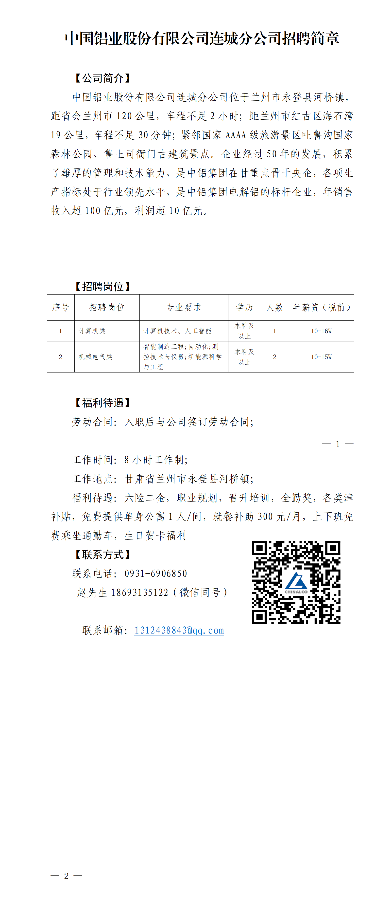 中国铝业股份有限公司连城分公司招聘简章