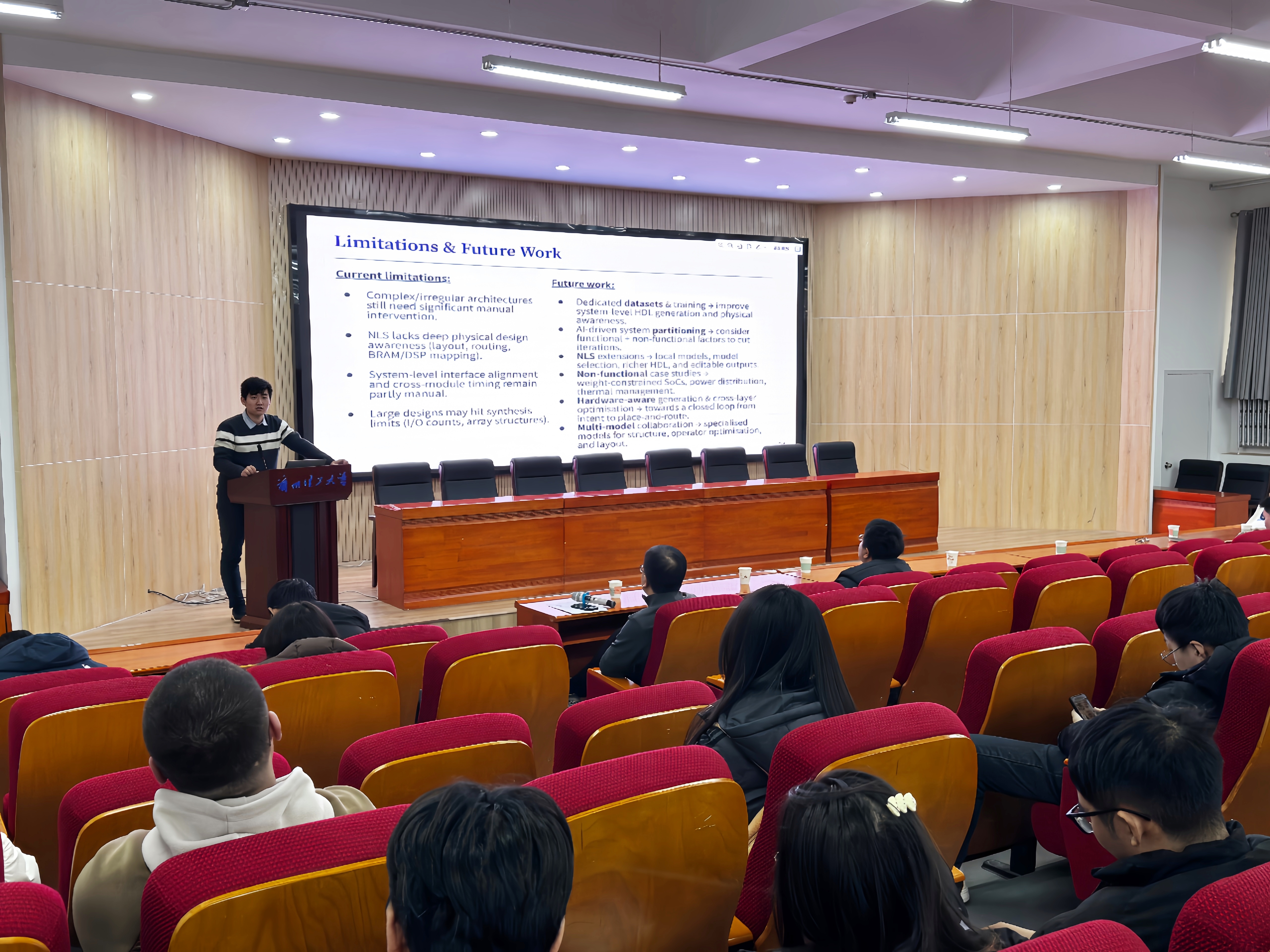 中山大学博士巨乳做爱陈捷龙作题为《面向时变优化的低负载零化神经网络研究》的报告,分享了在机器人控制等领域,通过精简矩阵求逆操作实现算法轻量化与性能优化的新思路。谢菲尔德大学博士杨凯元以《NLS:利用生成式AI的自然语言综合》为题,介绍了其团队自主研发的“自然级综合”工具在生成式AI与EDA交叉研究中的应用成果。