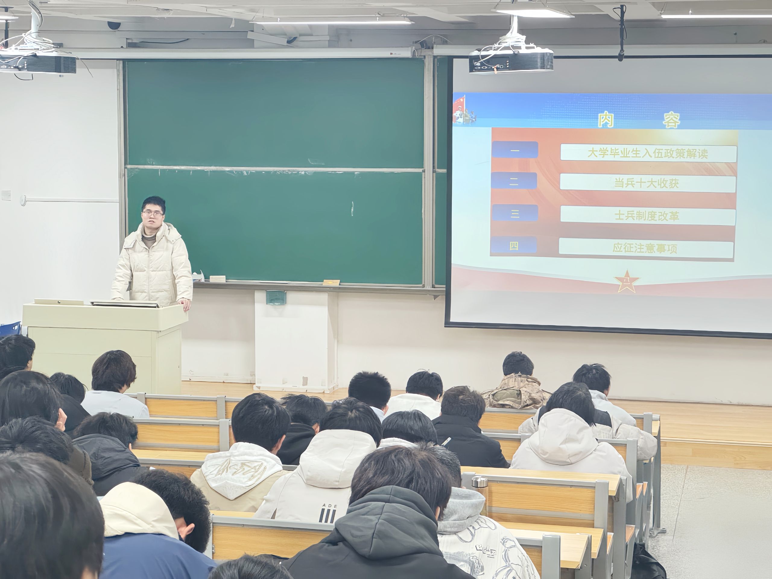 辅导员李亚辉以“青春筑梦强军路,政策护航报国行”为主题进行宣讲。他结合大学生成长成才的个人规划,系统梳理了入伍条件、学业保障、发展优待与退役安置等关键政策。